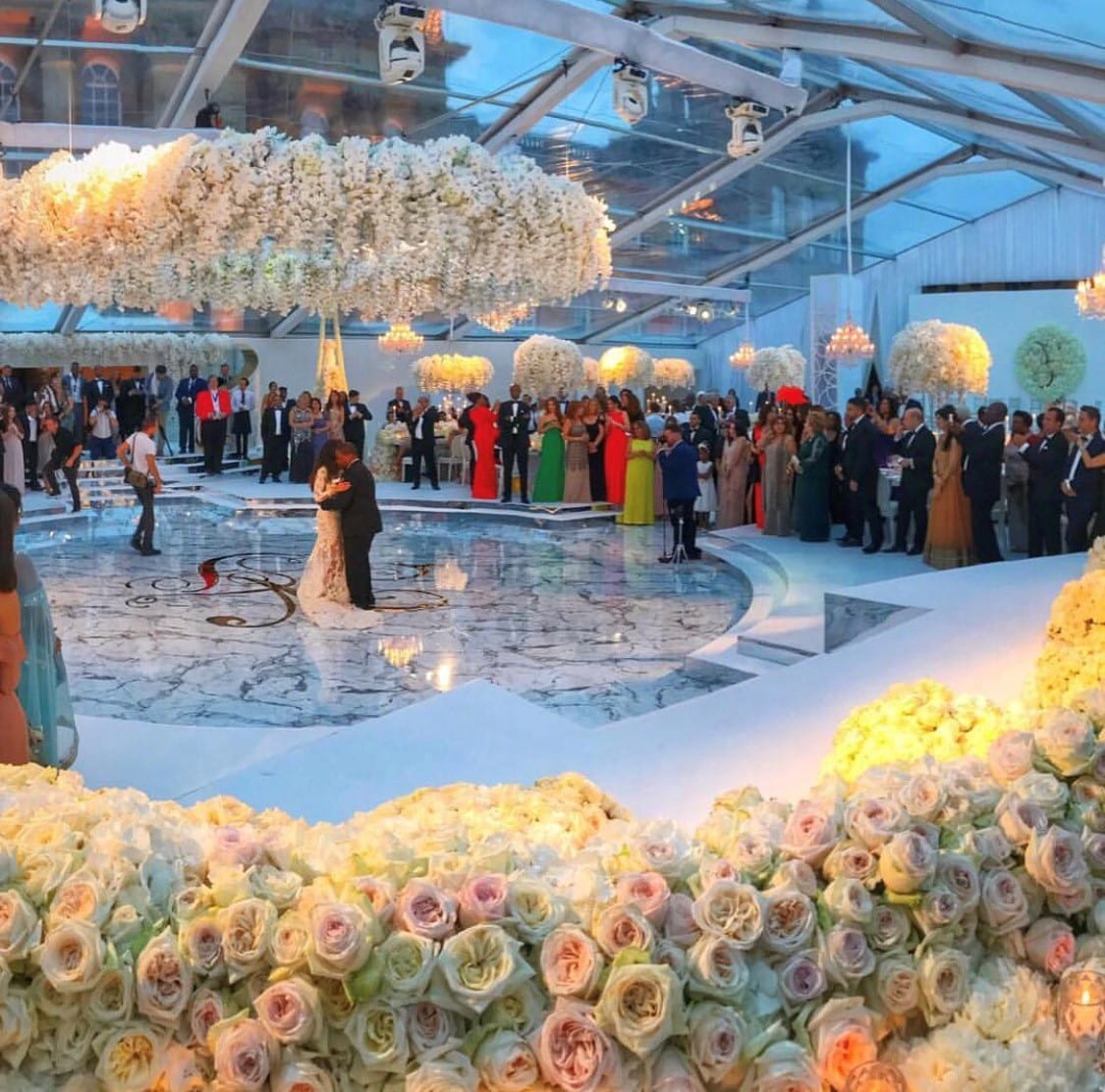 Det lykkelige par dansede deres første dans på et marmordansegulv, omgivet af 1 million hvide roser og 16 funklende krystal Maria Theresa lysekroner, som stemningsfuldt reflekterede lyset og tilføjede endnu mere klasse til brylluppet. Gæstelisten alene afslørede, at dette bryllup havde stil, med gæster fra hele verden.