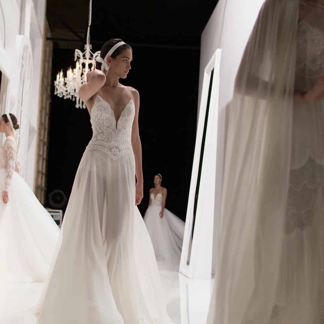 Smukke lysekroner som dekoration øger eksklusiviteten hos brudemodebrandet Rosa Clará under Barcelona Bridal Fashion Week.