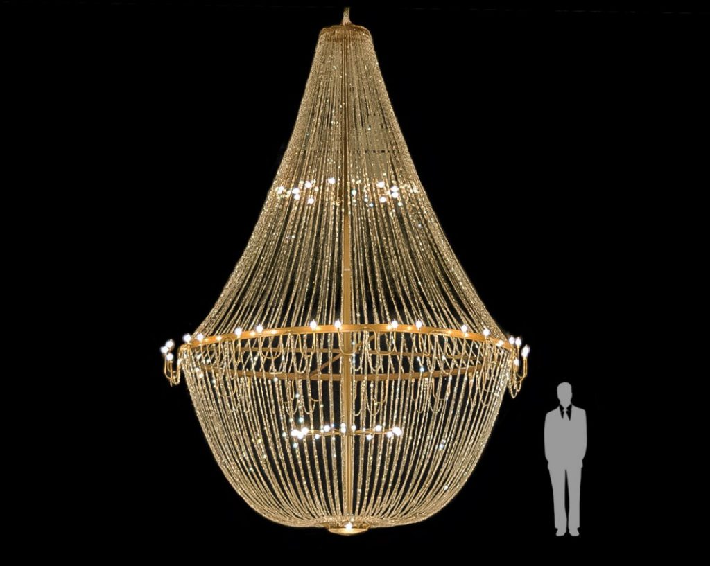 Empire, or Empire chandelier, is originally a pure French style which originated in France. After the French Revolution this style flourished. Initially, Empire was an interior style for the better citizens. Napoleon had his castles and palaces decorated in this ‘modern’ style. It resulted in the final Empire chandelier. A model which is still popular nowadays. Empire chandeliers decorate a wide range of buildings worldwide. In Europe, an Empire chandelier is frequently used as decoration or lighting of an event or wedding. The Empire chandelier is a crystal silhouette, that creates a sense of luxury, romance and class. For this reason, we don’t only rent these wonderful chandeliers for occasions like a gala, a dinner, a corporate event, but also for lighting and decoration of a fashion show, wedding or TV-show.